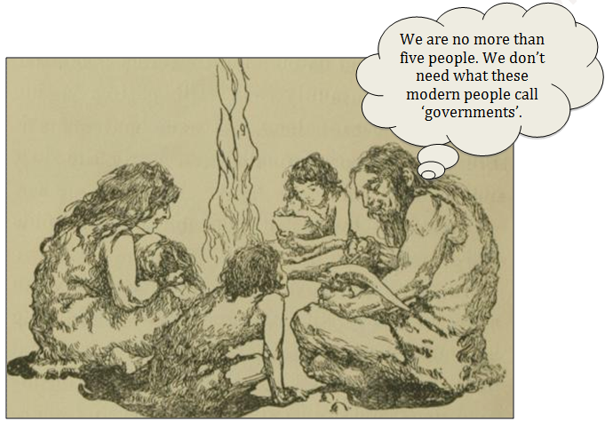 The first people didn't need any government, because there were so few people. Mostly people lived just with their own family or with one or two other families, and the older men and women decided what to do, without any system for deciding. If you didn't like how things were being done, you could always go out on your own, or join another family nearby. During the Old Stone Age and the Middle Stone Age, everyone lived this way.
